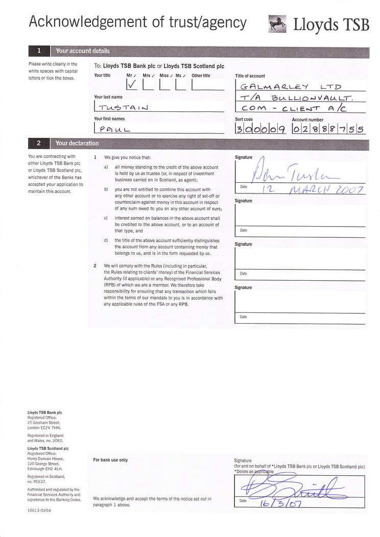 Lloyds Bank provides documents acknowledging the trust agreements for each client account, copies of which can be downloaded below.